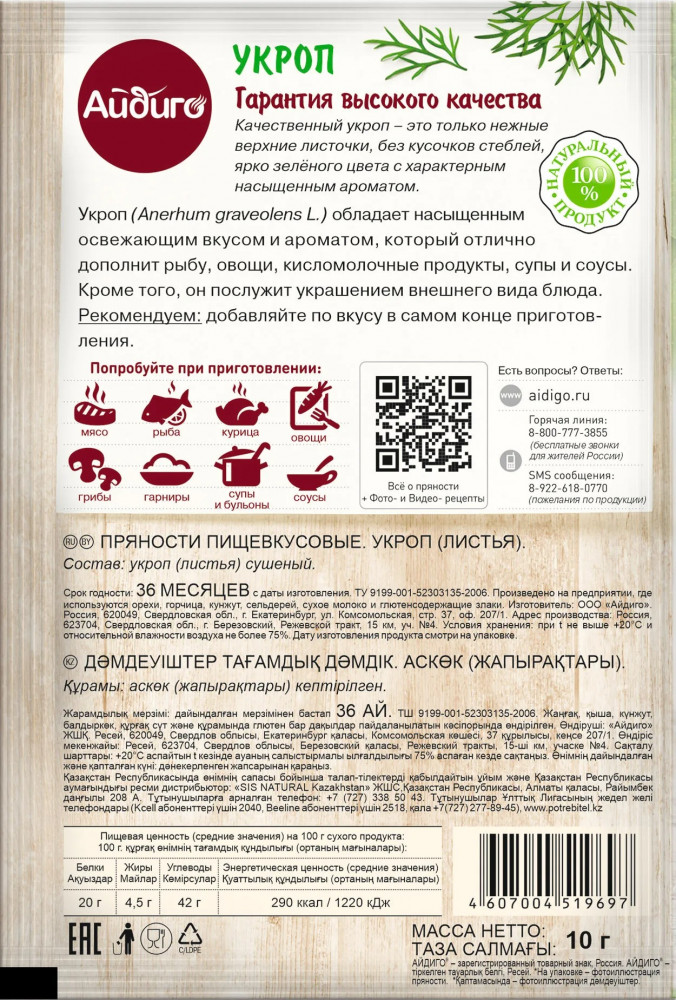 💳 Оплатить за товар можно при получении 🇰🇿 Есть бесплатная доставка по Казахстану 🎁 Копите бонусы с каждой покупки Укроп — одна из наиболее популярных специй во всем мире. Укроп обладает насыщенным свежим вкусом и ароматом, поэтому плохо сочетается с другими специями, однако способен усилить собственный вкус блюд. |