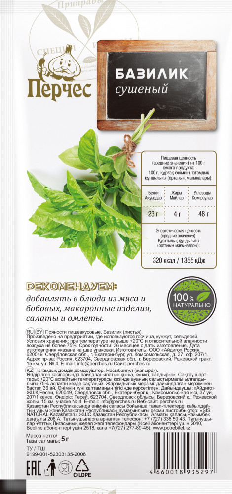💳 Оплатить за товар можно при получении 🇰🇿 Есть бесплатная доставка по Казахстану от 1 дня 🎁 Копите бонусы с каждой покупки Базилик — это неотъемлемый ингредиент средиземноморской кухни. Благодаря особому бережному способу сушки, базилик сохраняет эфирные масла, аромат которых заново раскрывается в процессе приготовления блюд. Базилик — прекрасная приправа к супам, салатам, овощным, мясным и творожным блюдам, уксусам и соленьям. |