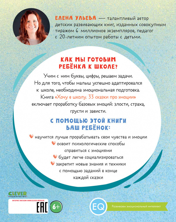 Книга «Хочу в школу. 33 сказки про эмоции» на примере добрых сказок с заданиями поможет вам и вашему ребенку легко выстроить диалог и разобраться, из-за чего возникают страх, грусть, зависть или злость и как справиться с этими чувствами. После каждой сказки в книге приводятся выводы, чтобы ребенок закрепил прочитанное, вопросы на отработку EQ (эмоционального интеллекта).