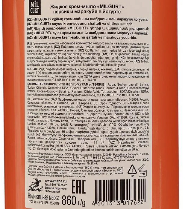Весна Мыло жидкое с ароматом персика и маракуйи в йогурте «Milgurt»