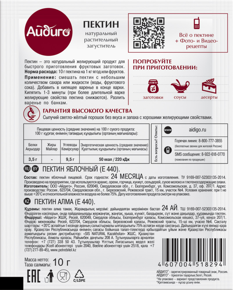 💳 Оплатить за товар можно при получении 🇰🇿 Есть бесплатная доставка по Казахстану от 1 дня 🎁 Копите бонусы с каждой покупки Пектин — склеивающее вещество растительного происхождения, о котором известно уже более 200 лет. В домашней кулинарии чаще всего используется при приготовлении желе, джемов и варенья. Приготовление данных блюд с пектином требует меньше времени, а заготовки с добавлением пектина имеют более насыщенный аромат. Пектин полезен тем, что стабилизирует обмен веществ, снижает уровень холестерина, улучшает перистальтику кишечника и периферическое кровообращение. В народе пектин также называют санитаром организма, так как он очищает организм от вредных веществ. Важно и то, что фрукты и ягоды не требуют продолжительной варки благодаря пектину, обладающему большой желирующей способностью. В результате они сохраняют свой натуральный цвет, вкус, аромат, а также большую часть витаминов. Норма расхода: 10 г пектина на 1 кг ягод или фруктов. |
