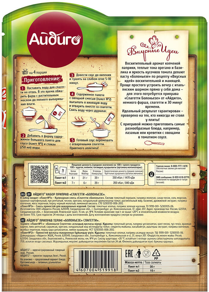 Айдиго Смесь для приготовления спагетти «Болоньезе»В данный момент этот товар отсутствует в продаже. Возможно, у нас найдется аналогичный или похожий товар здесь. Серия: Вкусные идеи Восхитительный аромат копченой паприки, теплые тона орегано и базилика и яркость кусочков томата делают пасту Болоньезе восхитительной и манящей. Проще простого устроить вечер с итальянским шармом прямо у себя дома — для этого потребуется смесь для приготовления спагетти «Болоньезе» от «Айдиго» , немного фарша, спагетти и 30 минут времени. Идеальный результат гарантирован — проверено на тех, кто никогда не стоял у плиты! |