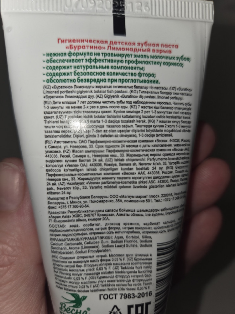 💳 Оплатить за товар можно при получении 🇰🇿 Есть бесплатная доставка по Казахстану от 1 дня 🎁 Копите бонусы с каждой покупки Гигиеническая детская зубная паста Буратино Лимонадный взрыв. Нежная формула не травмирует эмаль молочных зубов. Обеспечивает эффективную профилактику кариеса. Содержит натуральные компоненты. Содержит безопасное количество фтора. Абсолютно безвредна при проглатывании. |