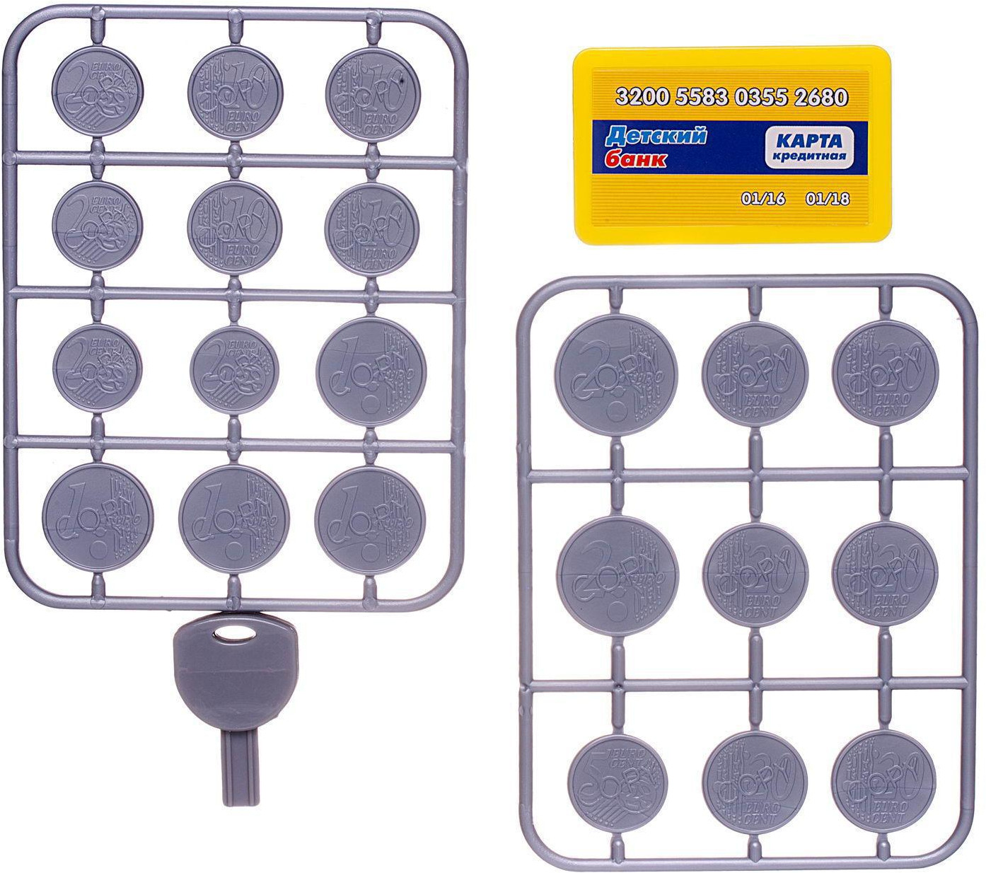 Расплатиться за покупки можно банковской карточкой или игрушечными купюрами и монетами из набора. Для хранения денег касса дополнена открывающимся вручную ящиком. Общаться с покупателями можно использую микрофон, который работает при удерживание специальной кнопки внизу кассы. Звуковые эффекты в наборе возникают при нажатие практически на любые кнопки, световой эффект имеет сканер.