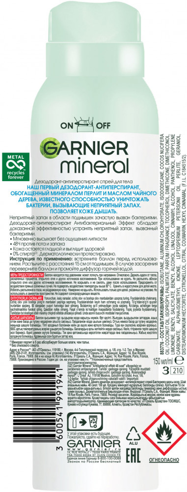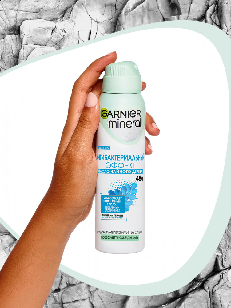 Garnier Дезодорант-антиперспирант спрей для тела «Mineral Антибактериальный эффект 48 ч»В данный момент этот товар отсутствует в продаже. Возможно, у нас найдется аналогичный или похожий товар здесь. Активная формула с экстрактом чайного дерева уничтожает 99,9% бактерий, вызывающих неприятный запах, а уникальный компонент Минерал Перлит, известный своими абсорбирующими свойствами, обеспечивает максимальную защиту от пота и запаха на 48 часов. Позволяет коже дышать, чтобы сохранить ее гладкой и здоровой. |
