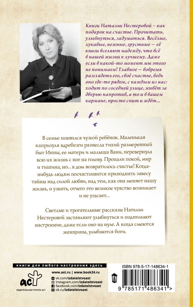 💳 Оплатить за товар можно при получении 🇰🇿 Есть бесплатная доставка по Казахстану от 1 дня 🎁 Копите бонусы с каждой покупки Серия: Между нами, девочками (м) В семье появился чужой ребёнок. Маленькая капризуля вдребезги разнесла тихий размеренный быт Инны, ее матери и малыша Вани, перевернула всю их жизнь с ног на голову. Пропали покой, мир и тишина, но... в дом возвратилось счастье! Когда-нибудь людям посчастливится приподнять завесу тайны над силой любви, над тем, как она меняет нашу жизнь, и узнать, отчего это великое чувство возникает и не угасает... |