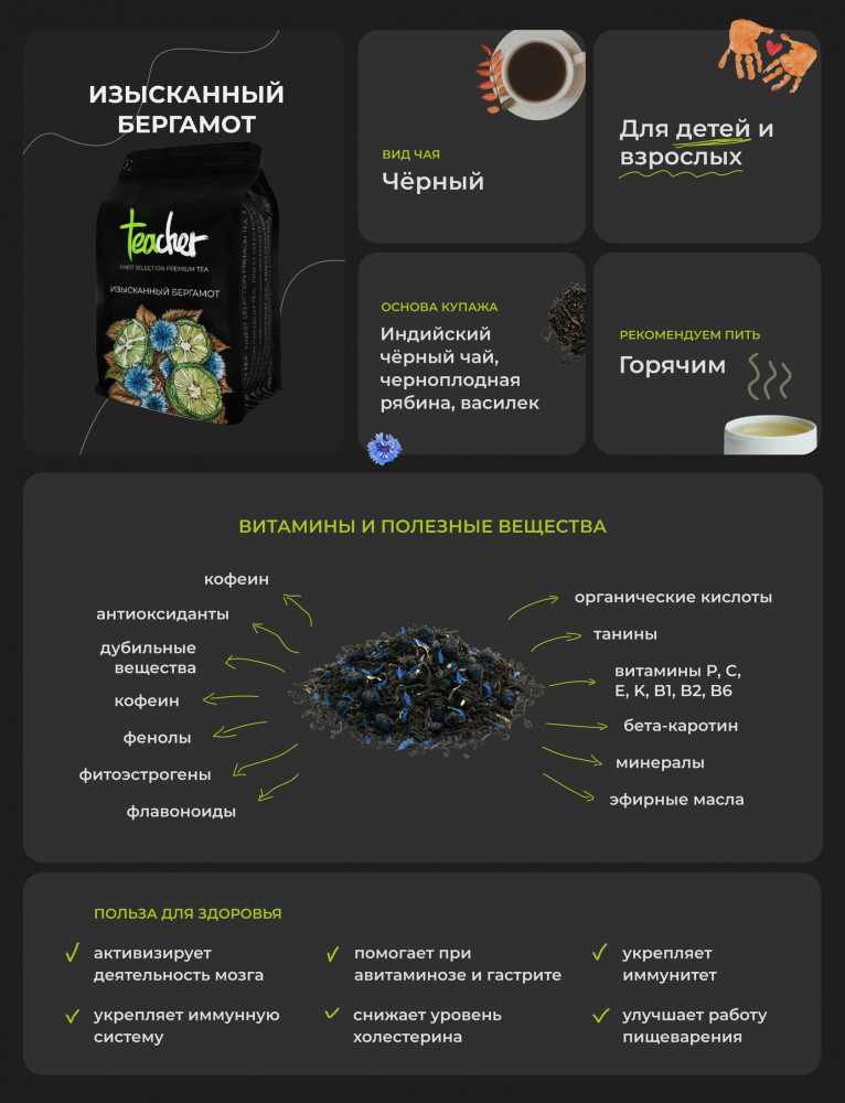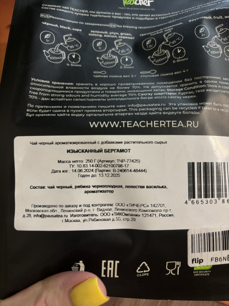 Очень вкусный натуральный чай, приятный насыщенный вкус бергамота и ещё сушёные фрукты также присутствуют