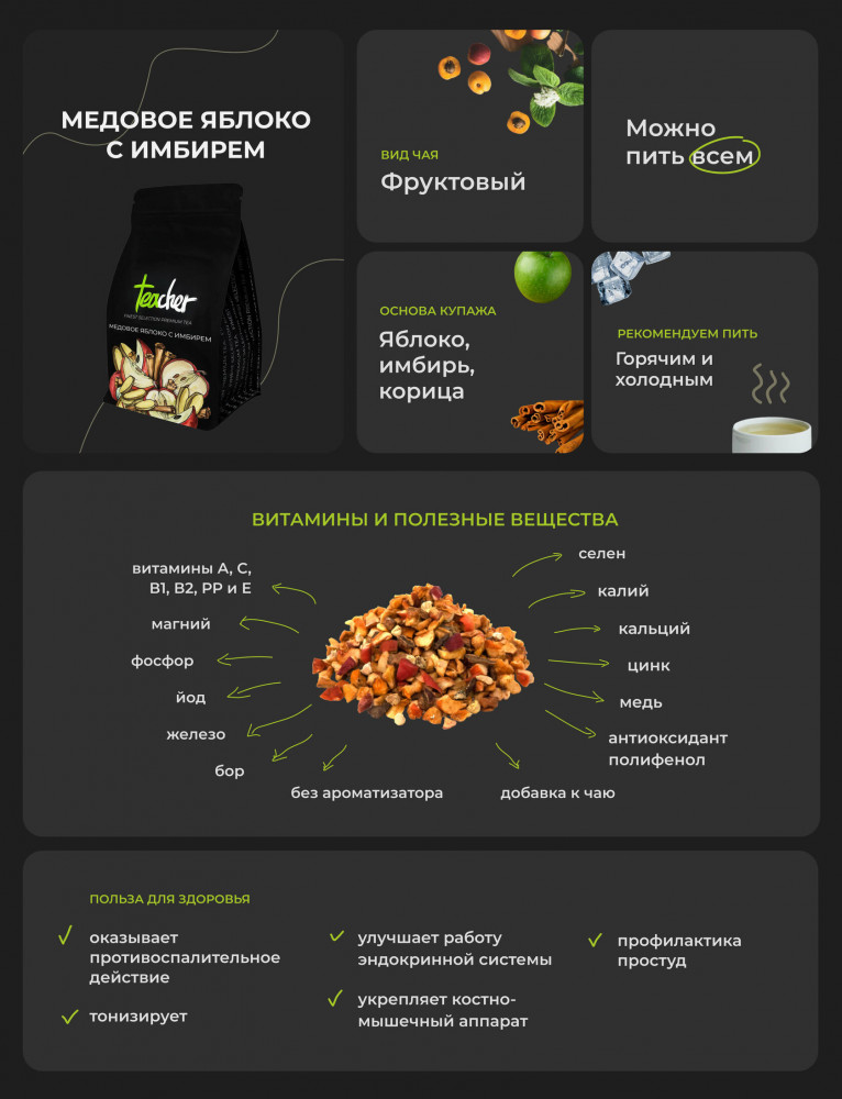 Teacher Напиток чайный «Медовое яблоко с имбирем»В данный момент этот товар отсутствует в продаже. Возможно, у нас найдется аналогичный или похожий товар здесь. Кусочки наливных яблок, хранящие тепло летнего солнца, приправлены имбирем и корицей. Напиток оставляет мягкое яблочное послевкусие с деликатной кислинкой. Благодаря богатому комплексу витаминов, железу, кальцию и пектину, содержащимся в яблоках, и антисептическим свойствам пряностей, эта фруктовая смесь — верный выбор для поддержания хорошего самочувствия. |