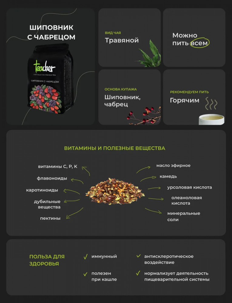 Teacher Напиток чайный «Шиповник с чабрецом»В данный момент этот товар отсутствует в продаже. Возможно, у нас найдется аналогичный или похожий товар здесь. Фиточай Шиповник с чабрецом от Teacher состоит только из экологически чистых компонентов — высокогорного чабреца, собранного вручную, и плодов шиповника. Шиповник и листья чабреца — рекордсмены по содержанию витамина С и являются эффективным натуральным антибактериальным и противовоспалительным средством. Подходит как для самостоятельного заваривания, так и в качестве добавки к чаю. |