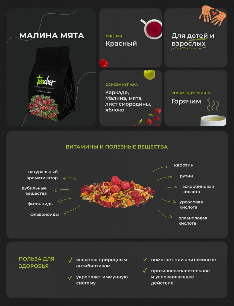 Teacher Чай листовой «Малина мята»В данный момент этот товар отсутствует в продаже. Возможно, у нас найдется аналогичный или похожий товар здесь. Малина с мятой от Teacher — новая вкуснейшая версия полезного напитка с повышенной концентрацией витаминов. Это не только целые крупные ягоды малины, но и кусочки сладкого яблока, яркие цветки гибискуса, душистые листья мяты, мелиссы и черной смородины. Подходит для употребления круглый год, как в горячем, так и в холодном виде с добавлением льда. Не содержит кофеина и танинов, поэтому рекомендован к употреблению маленьким детям и всем, кому противопоказан чай и кофе. |