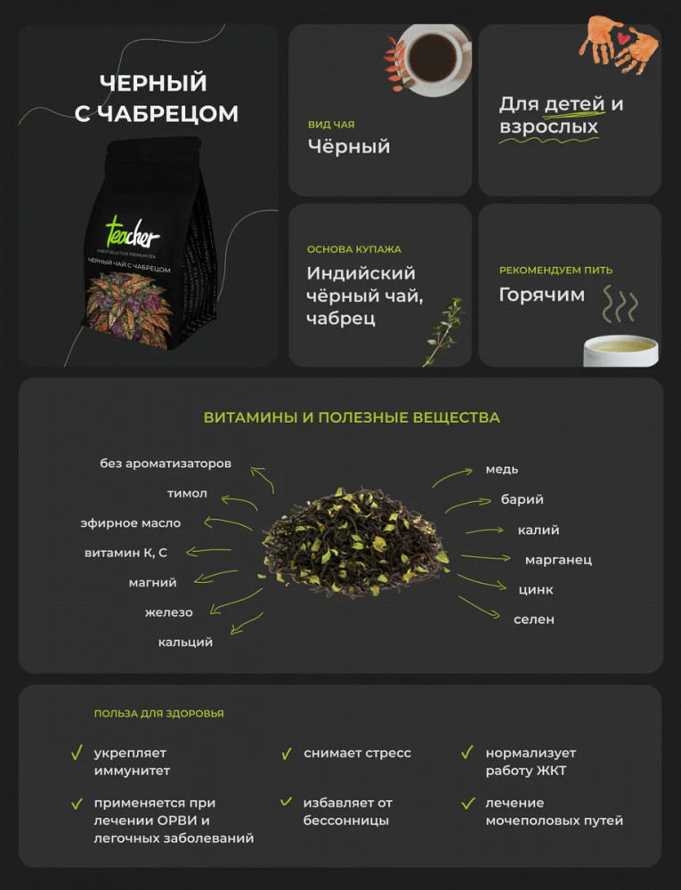 Teacher Чай листовой «Черный чай с чабрецом»В данный момент этот товар отсутствует в продаже. Возможно, у нас найдется аналогичный или похожий товар здесь. Пряный ароматный черный чай с чабрецом снимает напряжение от умственных и эмоциональных нагрузок и полезен для профилактики ОРВИ и гриппа. Листья чабреца, также известного как тимьян, ценятся за высокое содержание витаминов, флавоноидов и эфирного вещества тимола, оказывающего мощное бактерицидное действие и благотворно влияющего на дыхательную систему. |