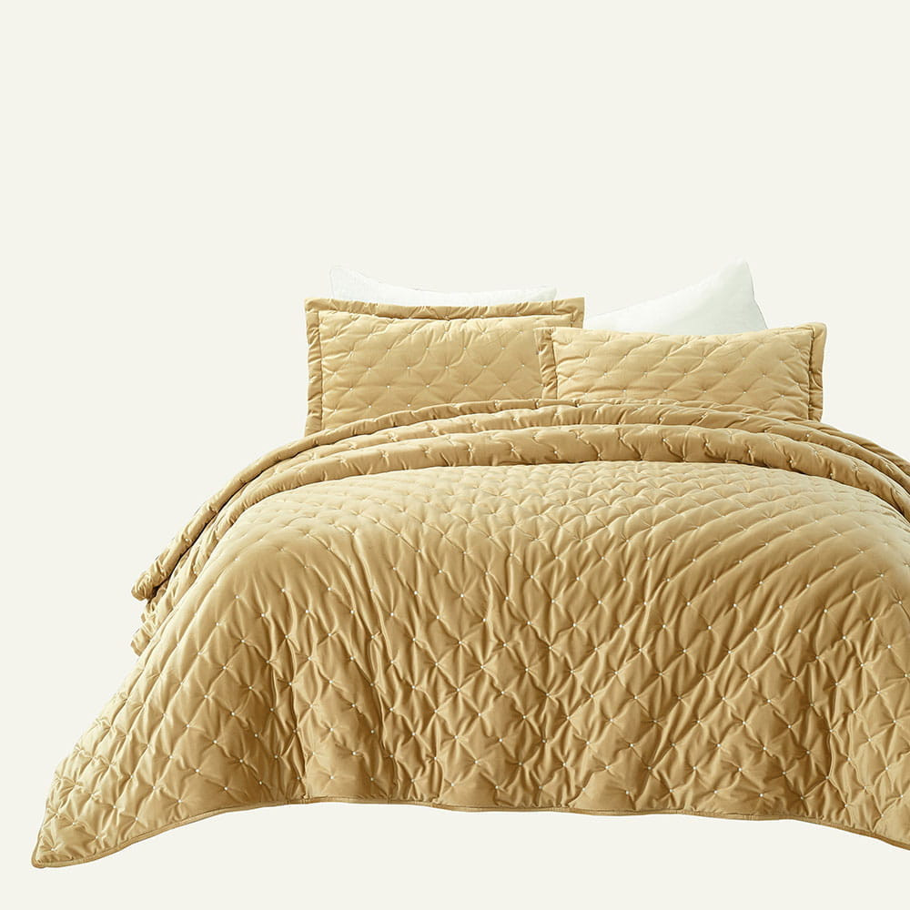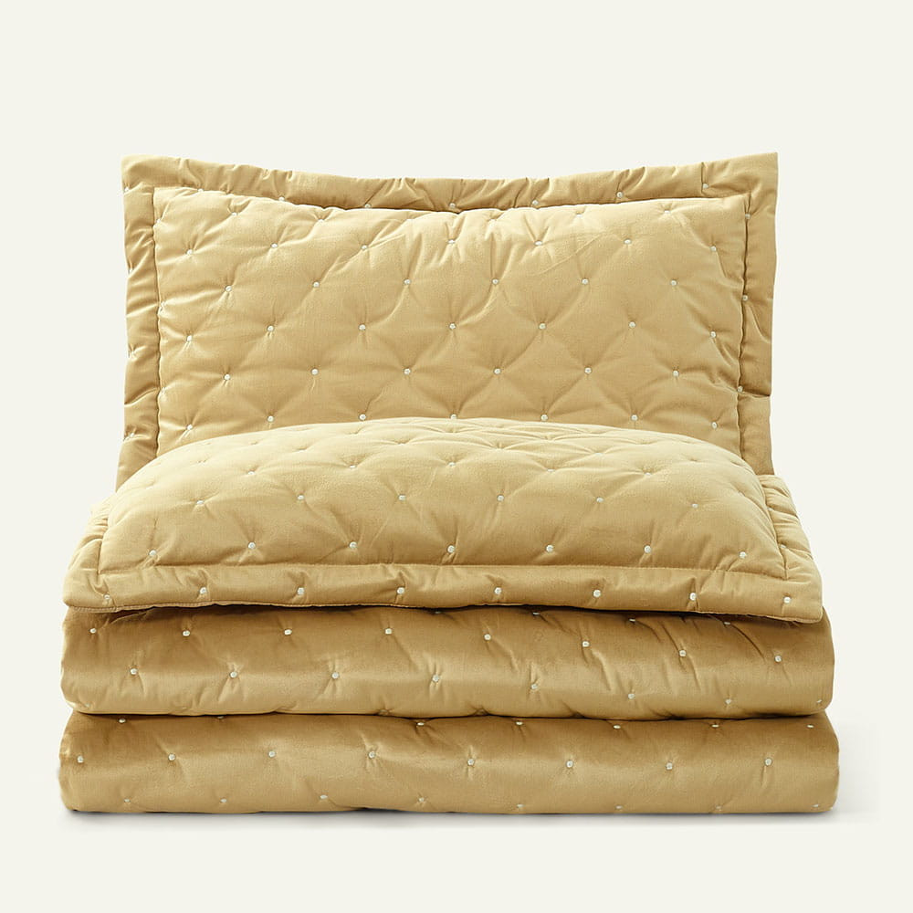 Красивое, приятное на ощупь покрывало с двумя наволочками. Цвет и размер соответствуют описанию. Но очень тяжелое.