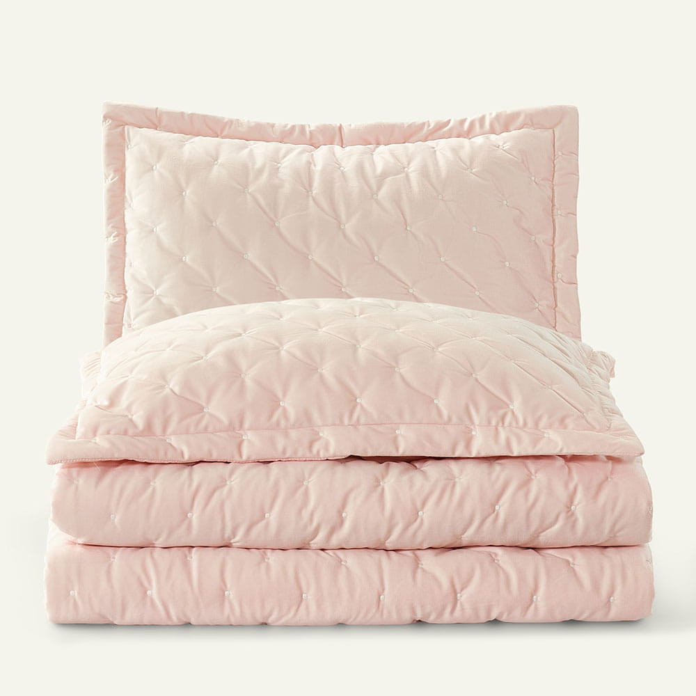 Красивое, приятное на ощупь покрывало с двумя наволочками. Цвет и размер соответствуют описанию. Но очень тяжелое.