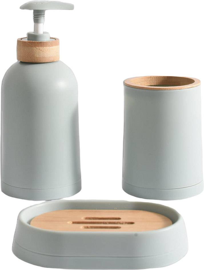 Набор состоит из 3-х предметов. Диспенсер можно использовать для мыла, шампуня, массажного масла или бальзамов. В стакане можно разместить зубные щетки, пасту, крема или мази и другую необходимую косметику. Такой набор сможет стать стильным дополнением ванной комнаты.
