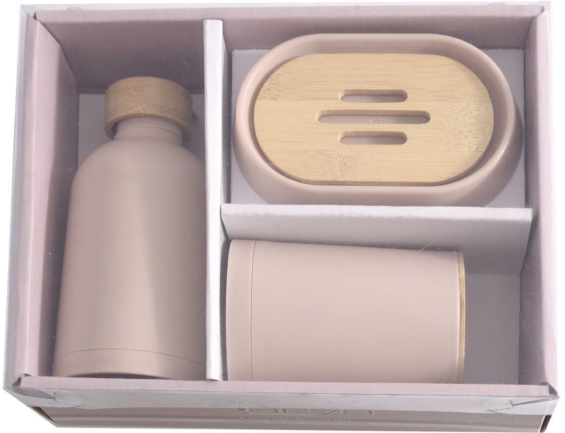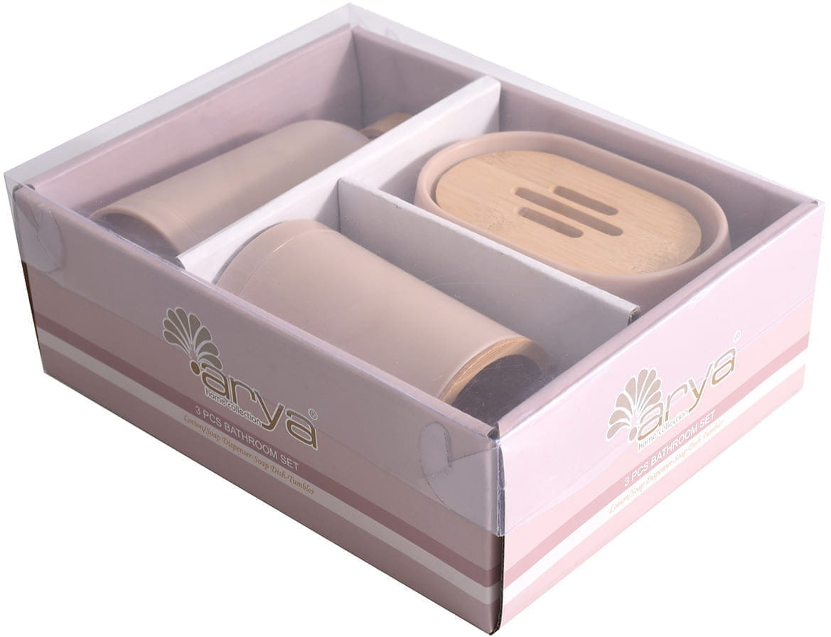 Набор состоит из 3-х предметов. Диспенсер можно использовать для мыла, шампуня, массажного масла или бальзамов. В стакане можно разместить зубные щетки, пасту, крема или мази и другую необходимую косметику. Такой набор сможет стать стильным дополнением ванной комнаты.