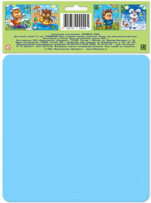 💳 Оплатить за товар можно при получении 🇰🇿 Есть бесплатная доставка по Казахстану от 1 дня 🎁 Копите бонусы с каждой покупки Обучающий комплект «Времена года» с четырьмя пазлами. Игры с этими замечательными мягкими пазлами способствуют развитию внимания, логики, мелкой моторики и памяти. Удобные крупные детали и большая яркая иллюстрация к каждому времени года не только развлечёт и надолго займёт ребёнка, но и поможет в развитии речи — ведь пока малыш складывает мозаику, можно вспомнить приметы каждого сезона, названия месяцев и даже придумать свою сказку по картинке. Пазлы предназначены для детей старше трёх лет. |