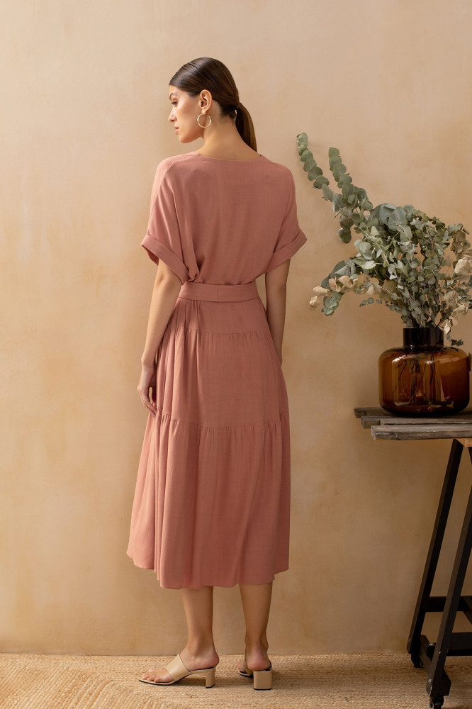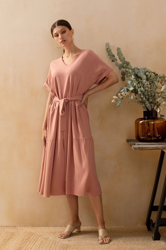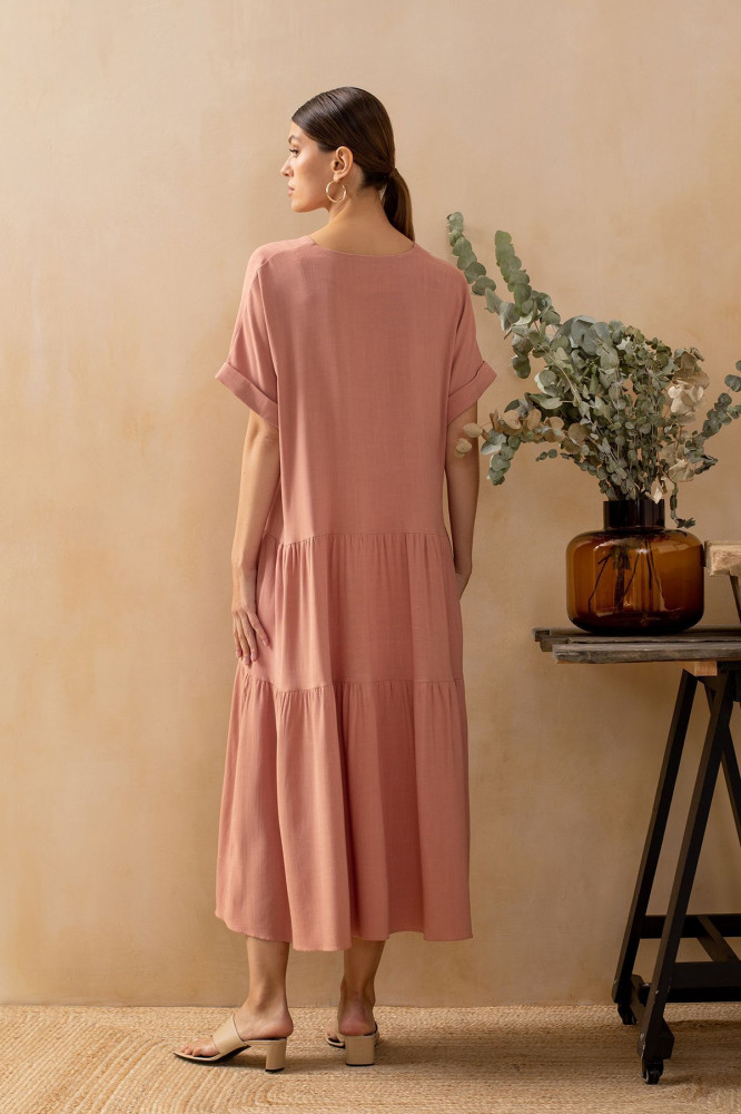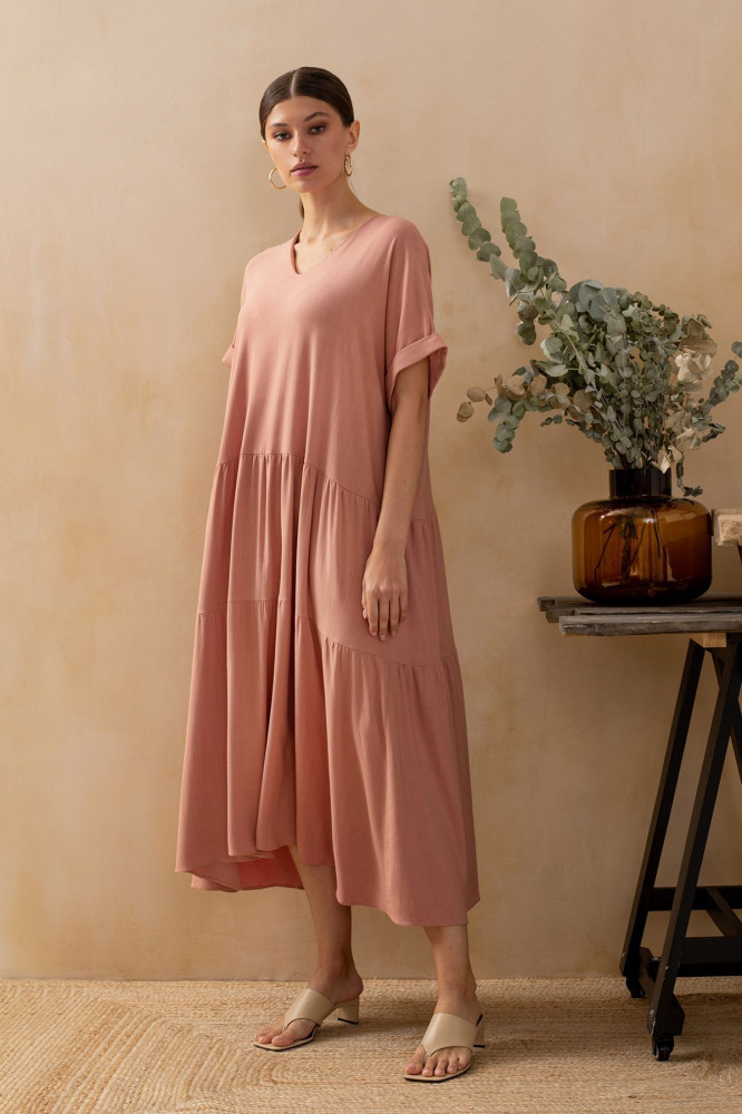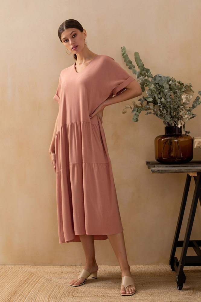 Лёгкое, комфортное. Ткань смотрится как лён. Можно и в гости, и в кафе, и на пляж. Длинное. На свой 46 р-р, рост 160, взяла 44, сидит свободно.