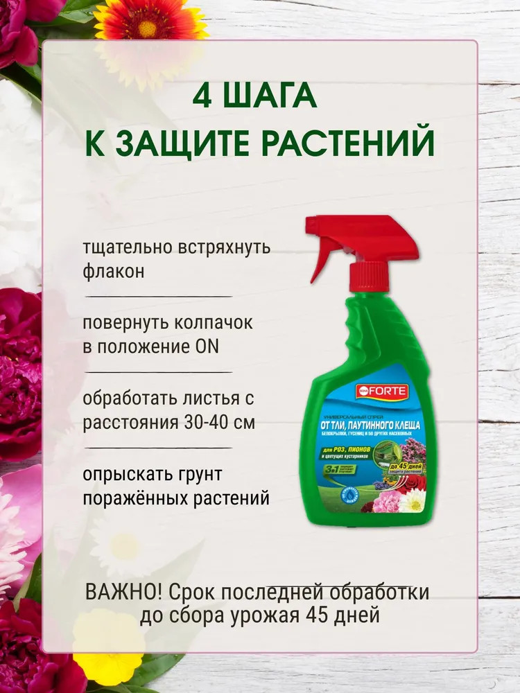 💳 Оплатить за товар можно при получении 🇰🇿 Есть бесплатная доставка по Казахстану от 1 дня 🎁 Копите бонусы с каждой покупки Спрей универсальный, защита растений от тли, паутинного клеща и 50 видов других насекомых Bona Forte. При обработке цветов и декоративных кустарников средство не только избавляет от тли, паутинного клеща, белокрылки и гусениц, но и эффективно борется с рядом других насекомых-вредителей: клещи, майские жуки, совки, долгоносики, цикадки, минирующие насекомые, клеверные клещи, луговые мотыльки, проволочники, трипсы, листоеды, пилильщики и другие насекомые. Действующие вещества быстро разлагаются до экологически безопасных остатков, не причиняя ущерб человеку и окружающей среде Одного флакона хватает до 40 м². |