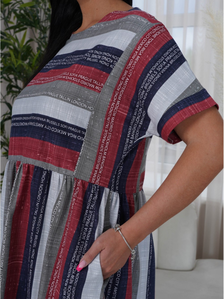 Замечательное, полоски состоят из мелких букв. 58 размер соответствует объему 116. Юбка для меня немного широкая.
