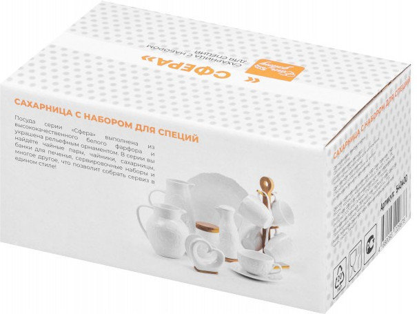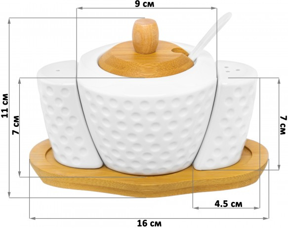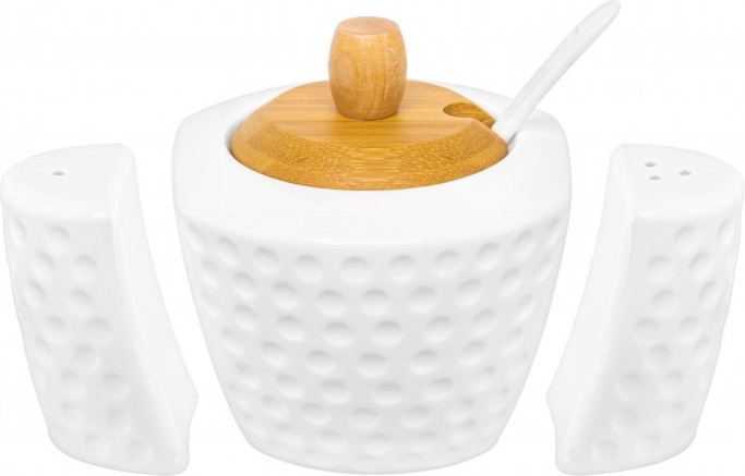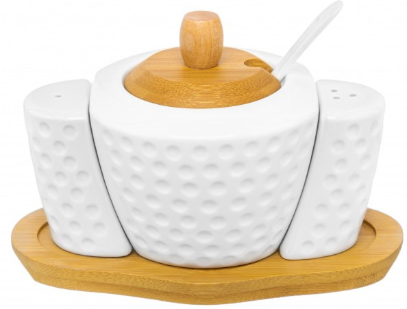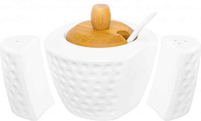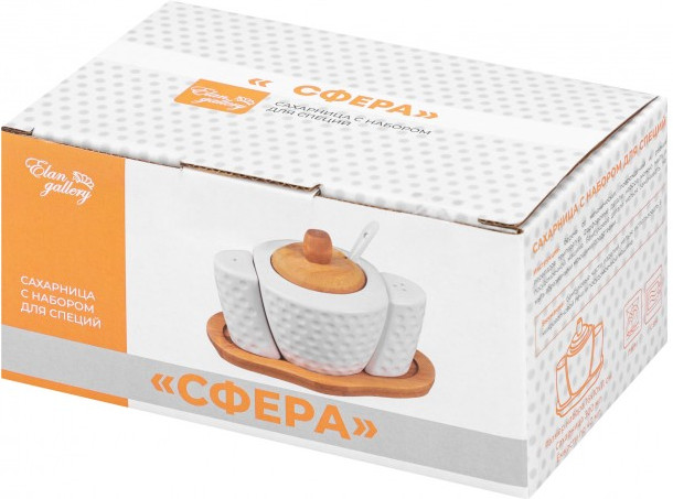 Набор серии посуды «Сфера» состоит из 3-х предметов на бамбуковой подставке: сахарница 300 мл, солонка и перечница по 40 мл. Сахарницу можно использовать для подачи к столу сахара, варенья, меда, соусов, специй и других продуктов.