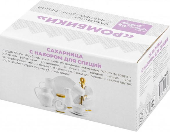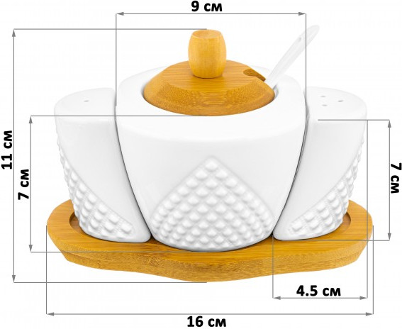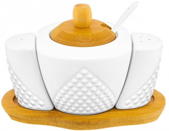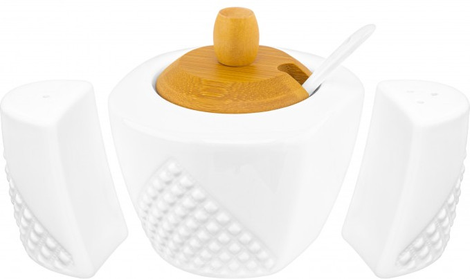 Набор серии посуды «Ромбики» состоит из 3-х предметов на бамбуковой подставке: сахарница 300 мл, солонка и перечница по 40 мл. Сахарницу можно использовать для подачи к столу сахара, варенья, меда, соусов, специй и других продуктов.
