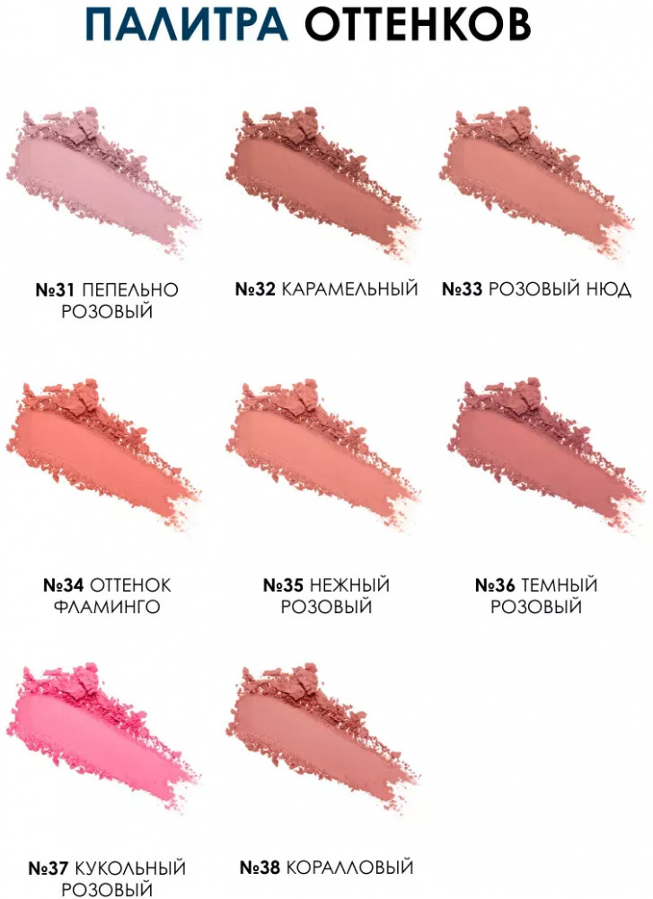 34 фламинго. Хорошо пигментирование, без Шимера. Наносятся легко. Коробочка маленькая, без зеркала. Продукта много, хватит надолго