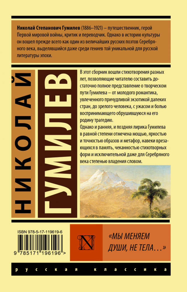 💳 Оплатить за товар можно при получении 🇰🇿 Есть бесплатная доставка по Казахстану от 1 дня 🎁 Копите бонусы с каждой покупки Серия: Эксклюзив: Русская классика В этот сборник вошли стихотворения разных лет, позволяющие читателю составить достаточно полное представление о творческом пути Гумилева — от молодого романтика, увлеченного причудливой экзотикой далеких стран, до зрелого человека, с ужасом и болью воспринимающего обрушившуюся на его родину трагедию. |