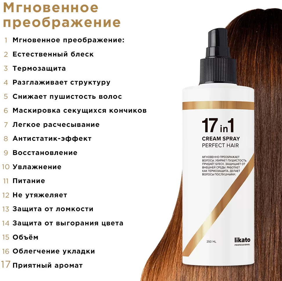 Likato Professional Спрей для идеальных волос 17 в 1В данный момент этот товар отсутствует в продаже. Возможно, у нас найдется аналогичный или похожий товар здесь. Спрей для мгновенного восстановления волос 17 в 1 заменяет сразу несколько средств в уходе за волосами, тем самым выполняет ряд функций: |