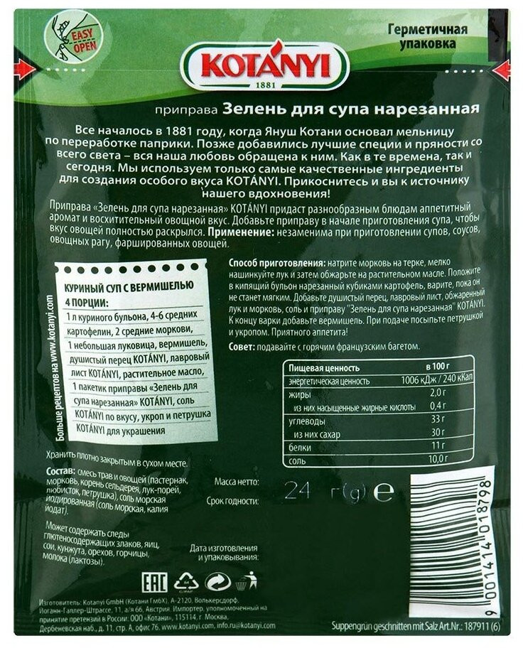 Kotanyi Приправа «Зелень для супа нарезанная»В данный момент этот товар отсутствует в продаже. Возможно, у нас найдется аналогичный или похожий товар здесь. Приправа Kotanyi «Зелень для супа» быстро придаст блюдам аппетитный аромат и восхитительный вкус свежей зелени. Подходит к супам, соусам, рагу и тушеным блюдам. |