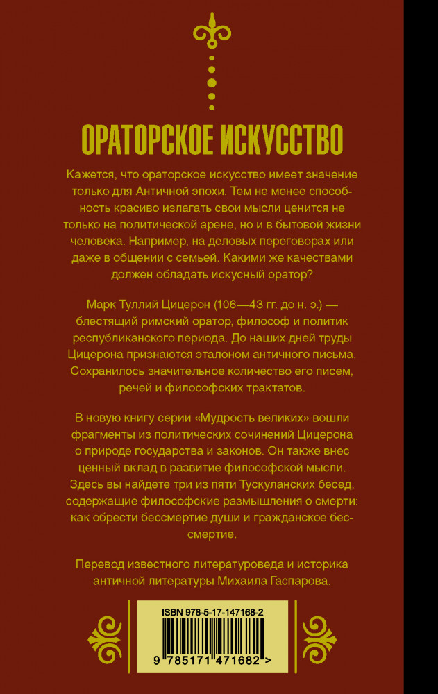 💳 Оплатить за товар можно при получении 🇰🇿 Есть бесплатная доставка по Казахстану от 1 дня 🎁 Копите бонусы с каждой покупки Серия: Мудрость великих Ораторское искусство ценилось не только в эпоху Античности. И в наши дни умение красиво и правильно говорить привлекает внимание, помогает вдохновлять и убеждать, дарит уверенность в себе. Какими же качествами должен обладать искусный оратор? |