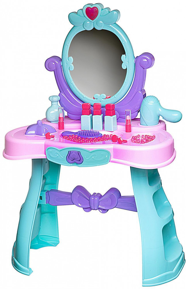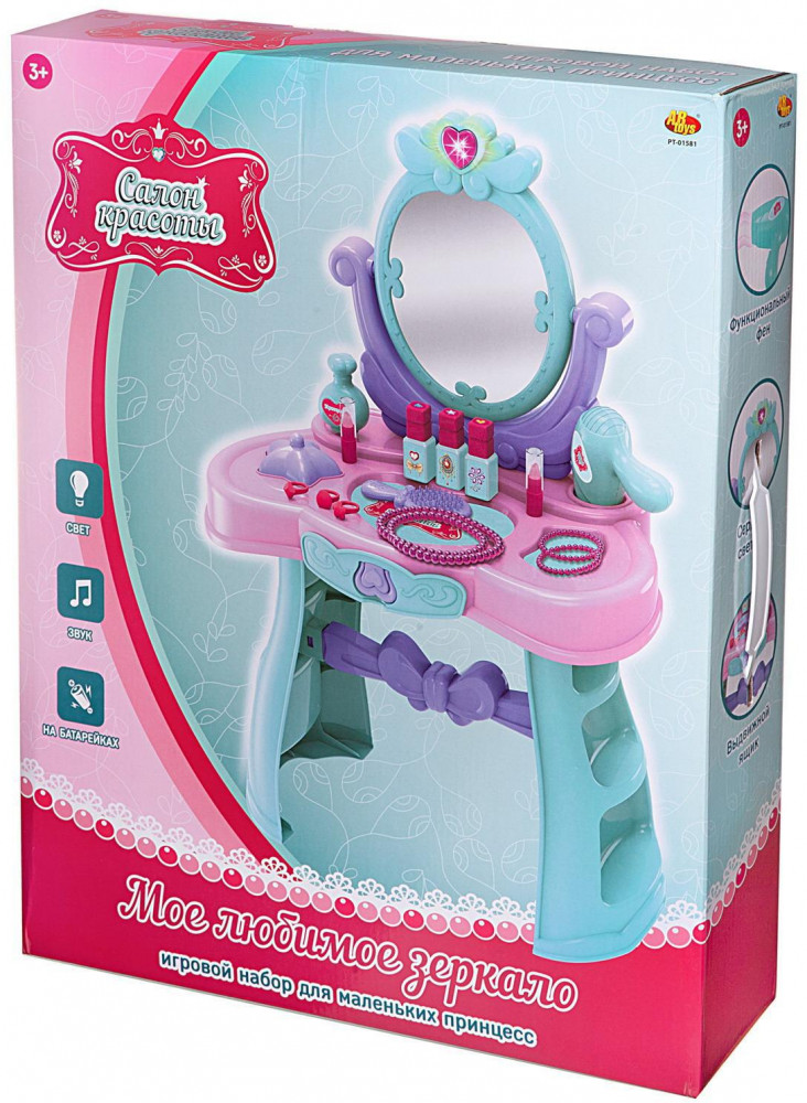 ABtoys Набор игровой «Принцесса»В данный момент этот товар отсутствует в продаже. Возможно, у нас найдется аналогичный или похожий товар здесь. Столик косметический из серии Салон красоты «Принцесса» — мечта каждой маленькой модницы. Теперь у каждой девочки будет свой уголок, где она, сидя перед зеркалом, сможет сделать макияж и придумывать элегантные и модные прически, совсем как мама! Украшает набор большое зеркало с сердечком в верхней части, при нажатии на которое включается подсветка и звучит мелодия. Входящий в состав набора фен можно включить, и он будет дуть, дополняя игровой процесс. У столика есть выдвижной ящик для хранения многочисленных предметов из этого набора: «косметики» и украшений. |