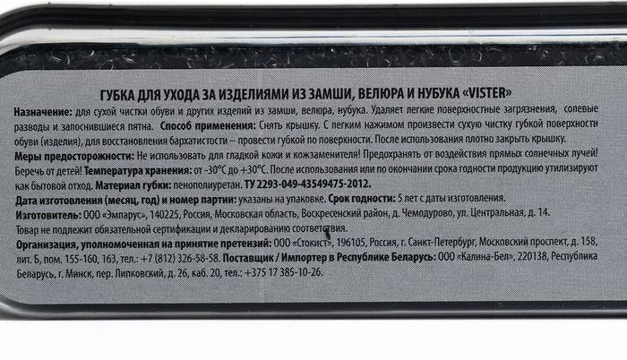 Vister Губка для обуви из замши, велюра и нубукаВ данный момент этот товар отсутствует в продаже. Возможно, у нас найдется аналогичный или похожий товар здесь. Для сухой чистки обуви и других изделий из замши, велюра и нубука. Удаляет легкие поверхностные загрязнения, солевые разводы. |