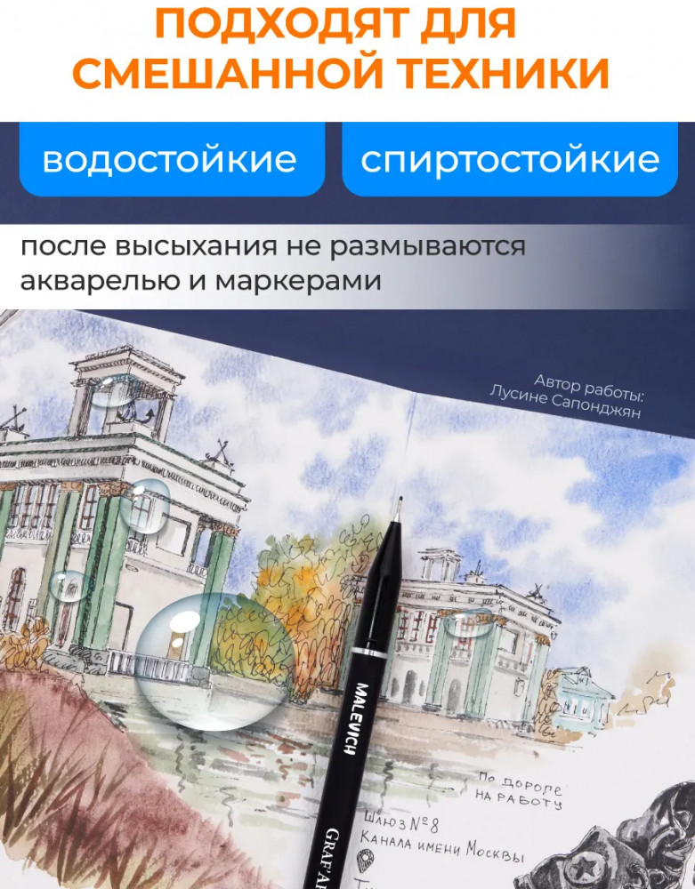 💳 Оплатить за товар можно при получении 🇰🇿 Есть бесплатная доставка по Казахстану от 1 дня 🎁 Копите бонусы с каждой покупки Серия: GrafArt Теперь новый дизайн корпуса линеров: удлинённый пишущий узел и эргономичная гладкая секция захвата, которую значительно удобнее держать в руке! Капиллярная ручка (линер) Малевичъ Graf’Art Pro — это профессиональный инструмент для письма, черчения и рисования. В ручках используются специальные водостойкие архивные чернила с высокой степенью светостойкости и глубоким черным цветом. Рисунок после высыхания не размывается водой, за счет этого линеры можно использовать в смешанной технике с акварелью, акрилом или гуашью. |