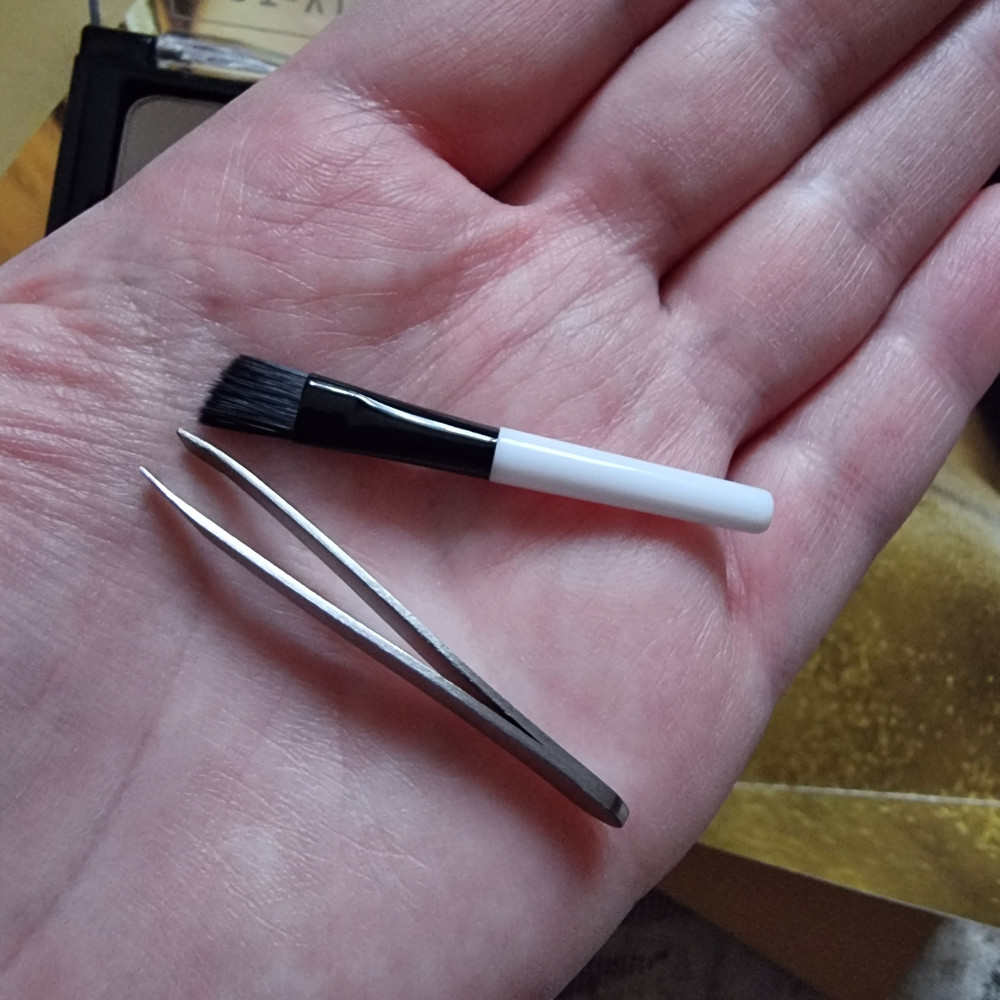 хорошо подошли для моих бровей и кожи, оттенок не рыжит, мягкая кисточка для бровей и есть пинцет
