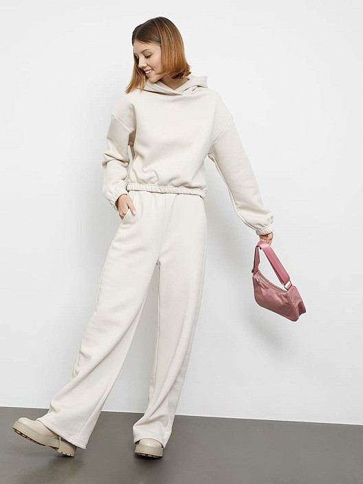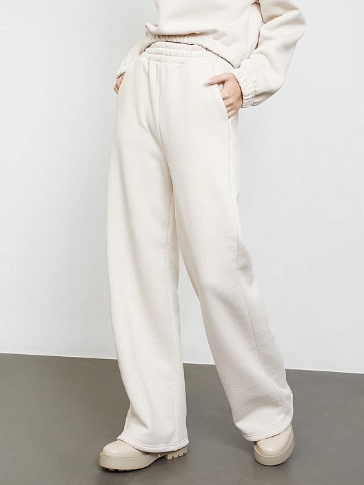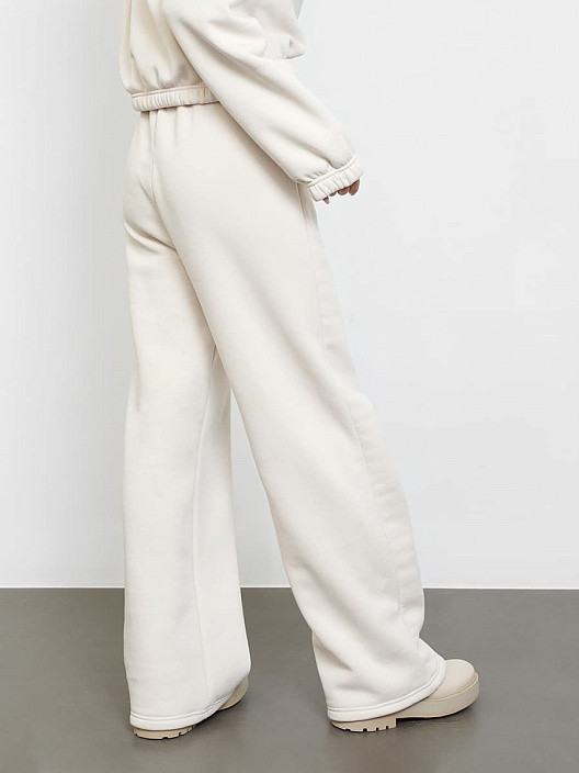 Брюки расклешенного силуэта из трикотажного футера с теплым подчесом. Пояс с эластичной тесьмой внутри и регулировочным шнуром-завязкой. Есть боковые карманы. Эти брюки — идеальный компонент для вашего стильного образа!