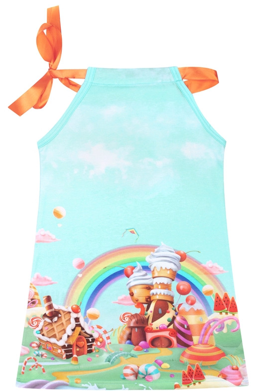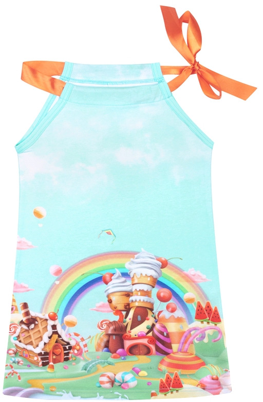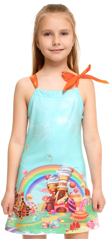Короткий сарафан для девочки выполнен из легкого хлопкового полотна с лайкрой. Атласная лента и яркий принт создадут праздничное настроение в летний день! Отличный наряд для маленьких принцесс!