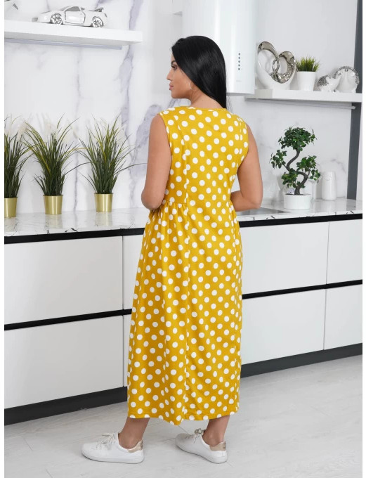 Платье мне понравилось, взяла 48 размер на мои параметры очень хорошо сидит по фигуре, в меру свободное, а ткань в горох всегда актуально. При первой стирке слегка линяло, швы ровные, не перекосило после стирки.