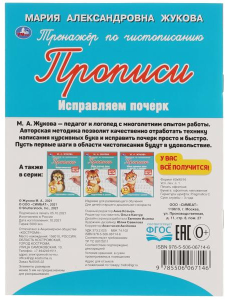 Данные прописи разработаны Марией Александровной Жуковой — педагогом и логопедом с многолетним опытом работы. Авторская методика позволит качественно отработать технику написания курсивных букв и исправить почерк, просто и быстро. Для достижения эффективных результатов в чистописании достаточно заниматься с детьми по 15 минут в день — главное, поддерживать их интерес и хвалить за успехи.