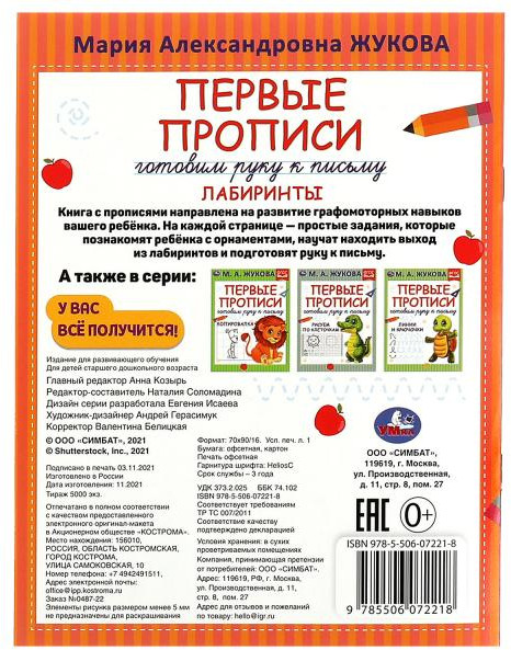 💳 Оплатить за товар можно при получении 🇰🇿 Есть бесплатная доставка по Казахстану от 1 дня 🎁 Копите бонусы с каждой покупки Первые прописи «М. А. Жукова. Лабиринты» — отличный помощник в подготовке руки к письму: |