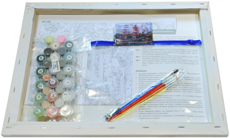 В набор для рисования по номерам входит все необходимое для создания картины: хлопковый холст на деревянном подрамнике, 4 специальных кисти разного размера, набор пронумерованных акриловых красок в вакуумной упаковке, пакет для хранения красок, подвес для картины, инструкция и контрольный лист.