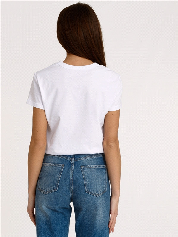 Футболка выполнена из кулира — легкого хлопкового полотна. Изделие свободного покроя с короткими рукавами и округлым вырезом горловины, украшено дизайнерским принтом.