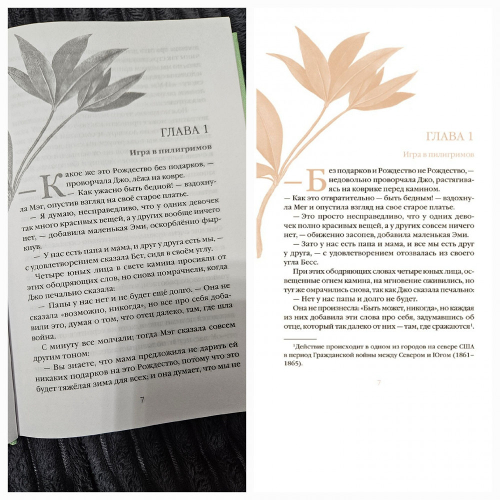 Добрая книга) Джо - моя любимица. Девочки все разные, но их объединяет несколько качеств: воспитанность, трудолюбие, полезность и конечно же, любовь к родным и миру. Временами кажется, что книга для подростков. Но! Для взрослых здесь будет интересна мама девочек, миссис Марч - кладезь премудрости. Она так бережно и тонко объясняет, показывает и воспитывает. В целом, рассказ в длиною год: от Рождества до следуещего Рождества. И за этот год девочки знакомятся с разными людьми, обстоятельствами, набивают шишки, получают ценные уроки. Интересно всё. Скоро прочту вторую часть. Спасибо, Флип💐