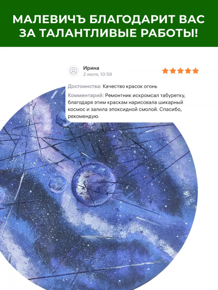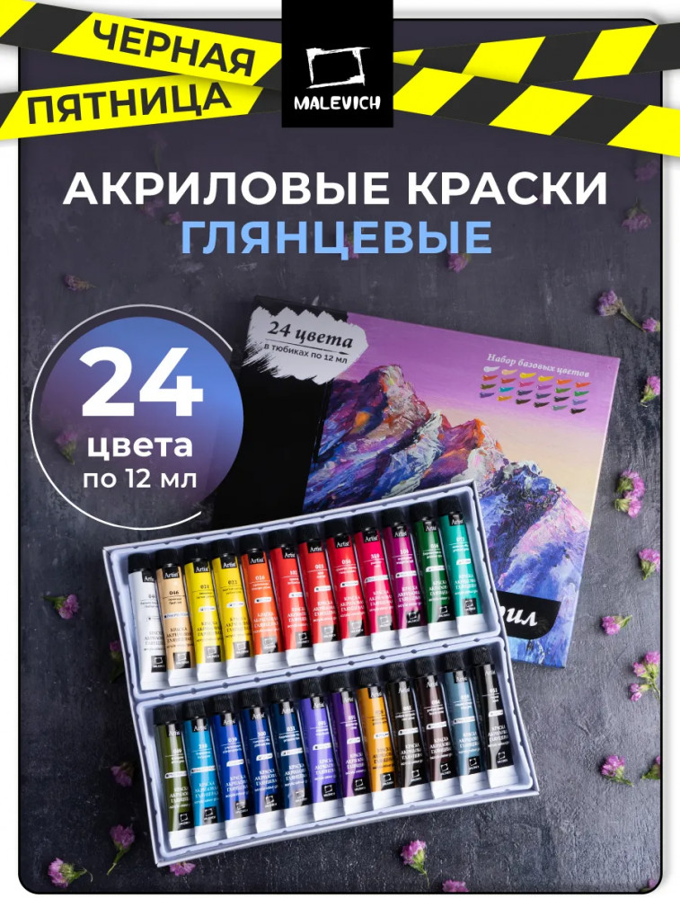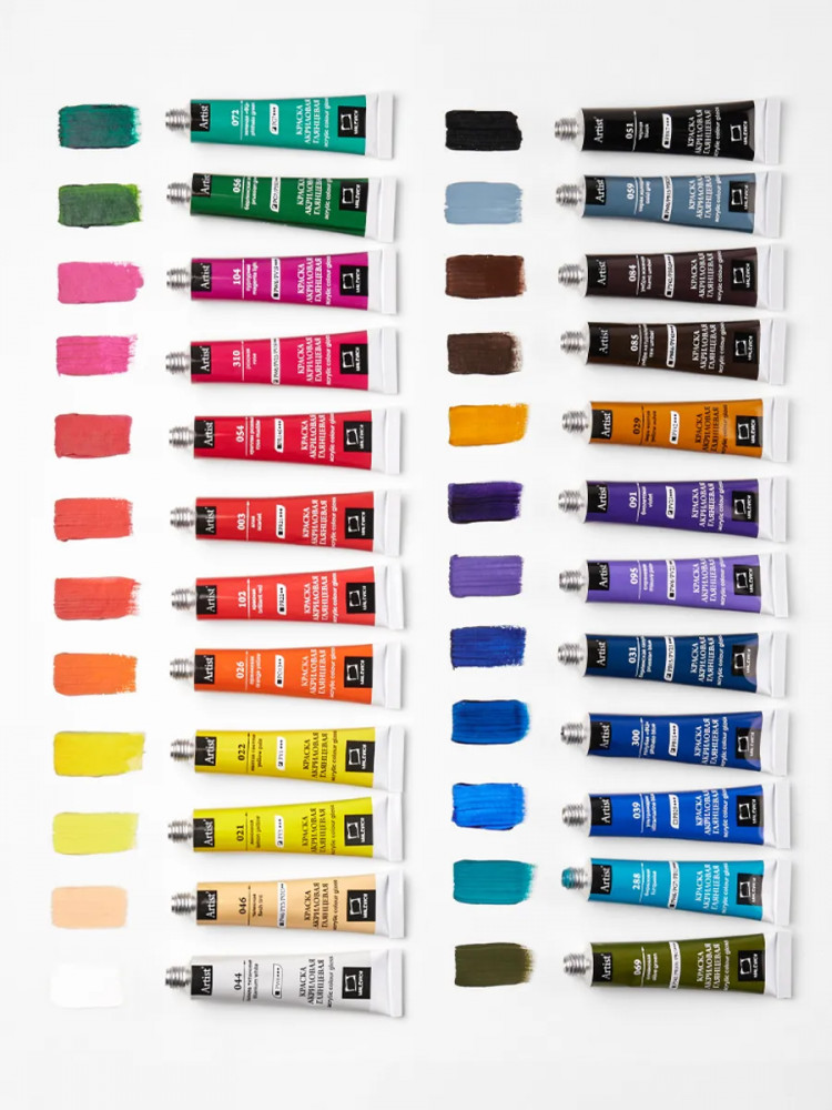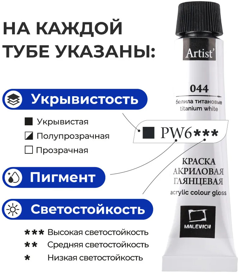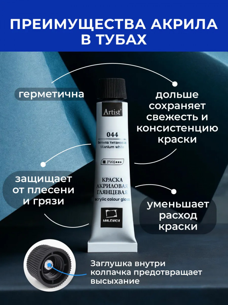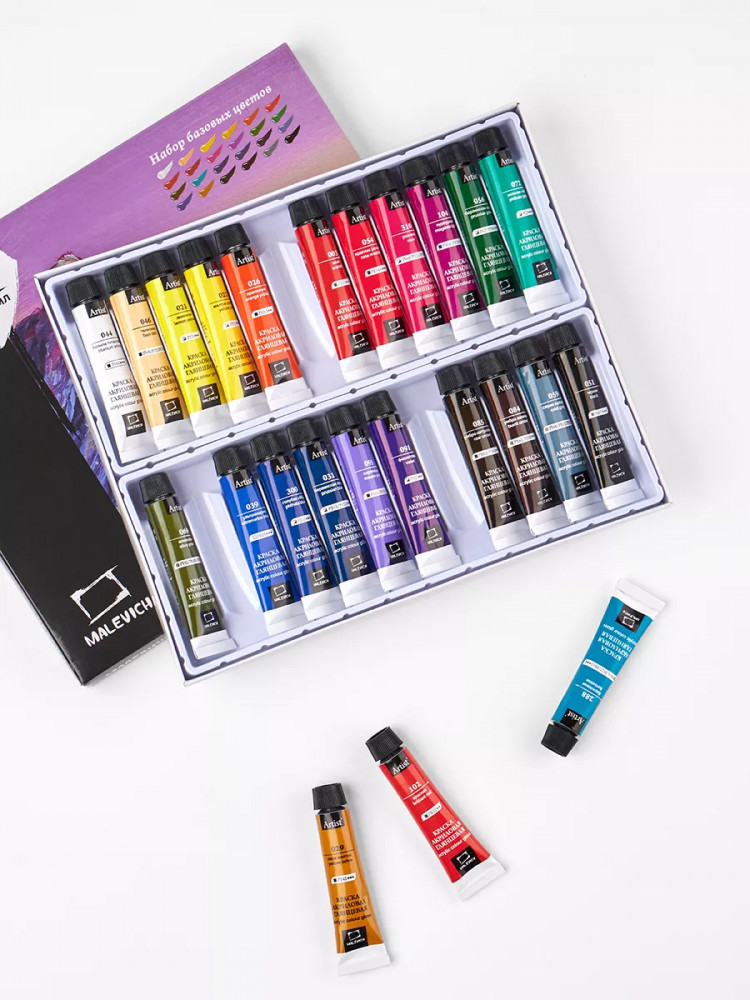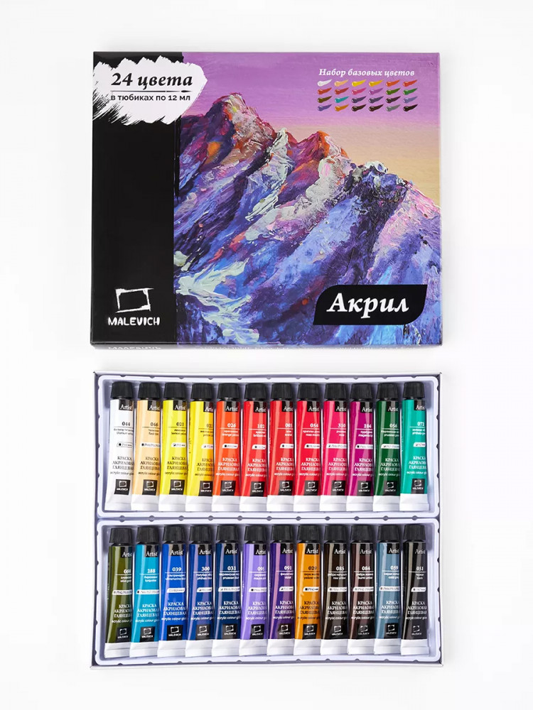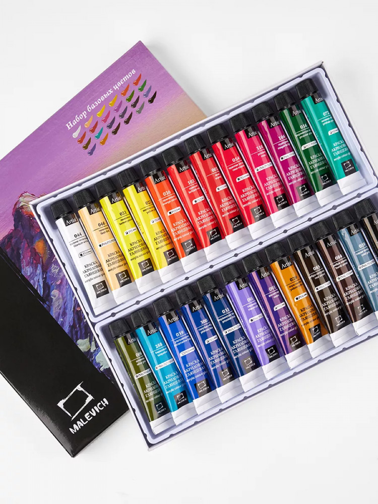 Акриловые краски от компании «Малевичъ» — это художественный глянцевый акрил для требовательных к качеству покупателей. В производстве используются только высококачественные светостойкие пигменты, которые обеспечивают сохранность будущего шедевра.