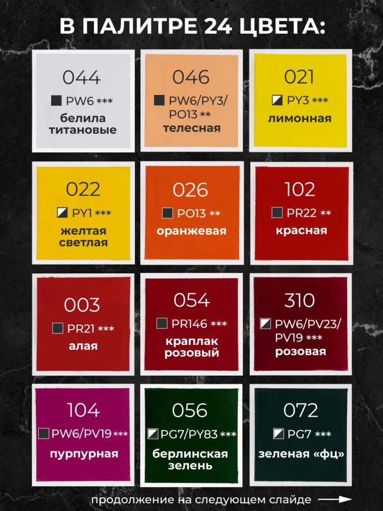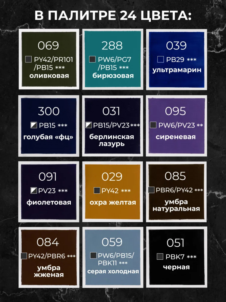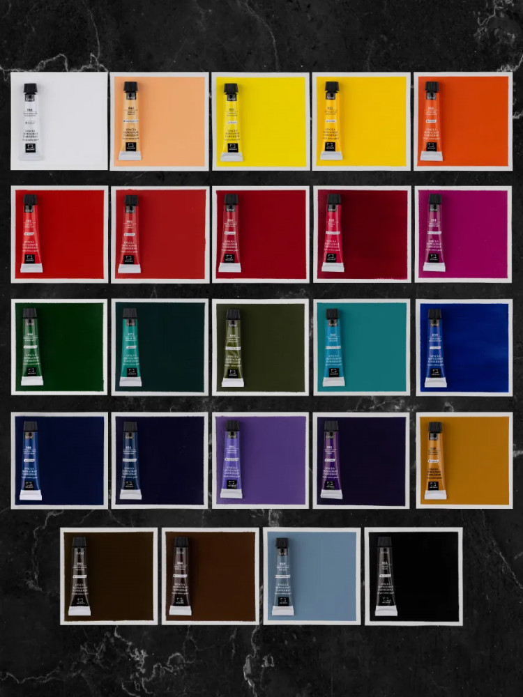 Состав набора: белила титановые, телесная, лимонная, желтая светлая, желтая темная, неаполитанская желтая, оранжевая, марс оранжевый, красная, алая, краплак розовый, нежно-розовая, розовая, пурпурная, желто-зеленая, зеленый средний, берлинская зелень, зеленая ФЦ, оливковая, бирюзовая, небесно-голубая, кобальт синий, ультрамарин, голубая ФЦ, берлинская лазурь, сиреневая, фиолетовая, охра желтая, сиена натуральная, сиена жженая, умбра натуральная, умбра жженая, марс коричневый, серая холодная, серая, черная. |