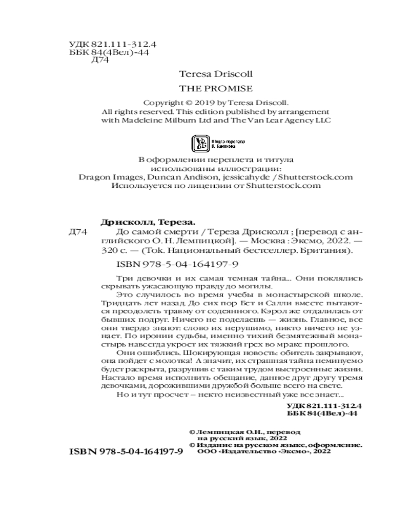 До самой смертиВ данный момент этот товар отсутствует в продаже. Возможно, у нас найдется аналогичный или похожий товар здесь. Серия: Tok. Национальный бестселлер. Британия Это случилось во время учебы в монастырской школе. Тридцать лет назад. До сих пор Бет и Салли вместе пытаются преодолеть травму от содеянного. Кэрол же отдалилась от бывших подруг. Ничего не поделаешь — жизнь. Главное, все они твердо знают: слово их нерушимо, никто ничего не узнает. По иронии судьбы именно тихий безмятежный монастырь навсегда укроет их тяжкий грех во мраке прошлого. |