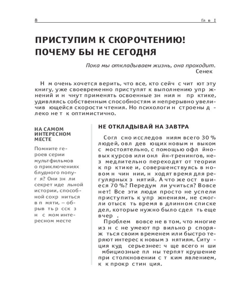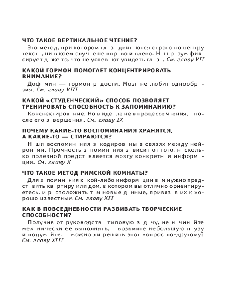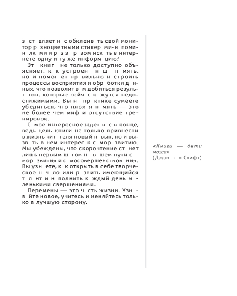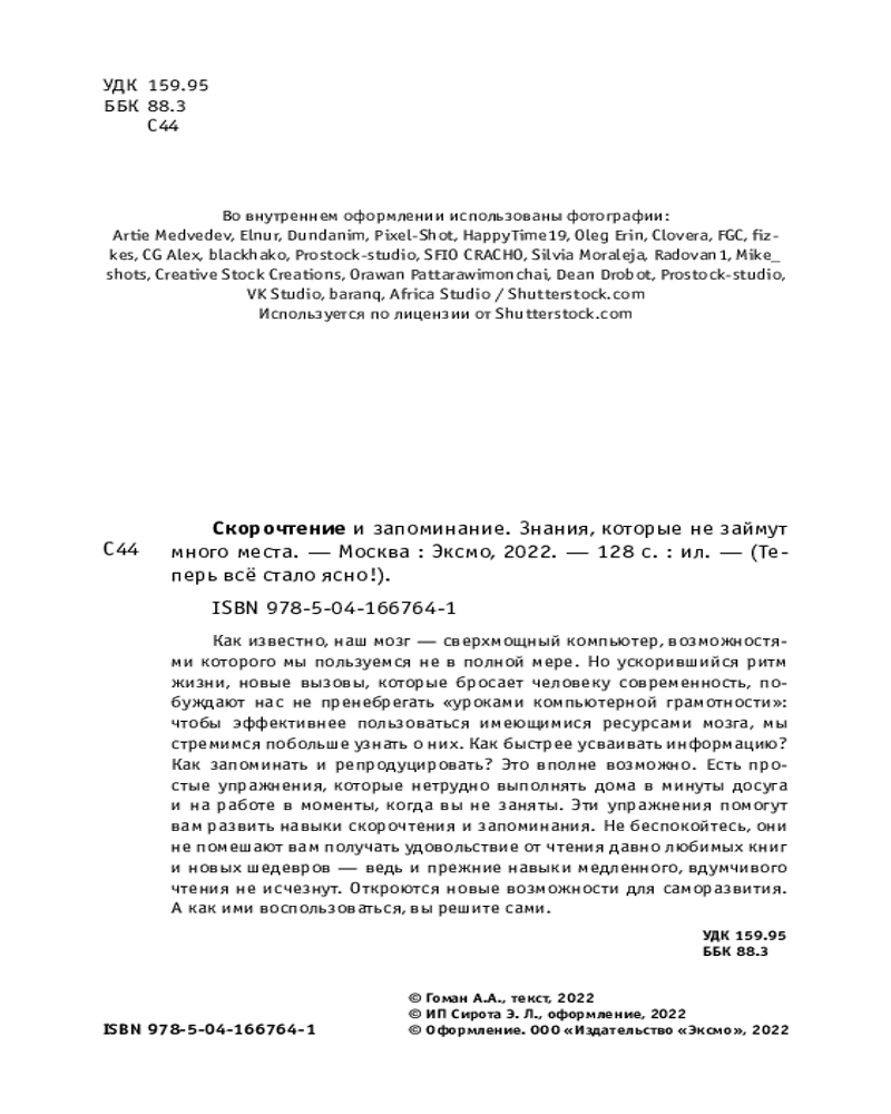 Скорочтение и запоминание. Знания, которые не займут много местатонкость книги переплет качество много воды В данный момент этот товар отсутствует в продаже. Возможно, у нас найдется аналогичный или похожий товар здесь. Серия: Теперь всё стало ясно! На долю современного человека выпало нелегкое испытание — необходимость ежедневно принимать и обрабатывать тонны новой информации. Согласно статистике, с каждым годом объем потребляемой информации увеличивается в среднем на 30%, что неизбежно приводит к нарушениям работы мозга и, как следствие, рассеянности, медлительности и раздражительности. Располагая таким мощным ресурсом, как мозг, каждый из нас может во много раз повысить свою эффективность в учебе, работе, отношениях, открыв в себе новую способность к скорочтению. Эта книга — кладезь полезной информации о механизмах работы человеческой памяти, с помощью которой вы сможете овладеть всеми возможностями своего разума. Помимо теории об устройстве памяти и о влиянии чтения на гибкость наших когнитивных способностей, в книге также представлены простые, но крайне эффективные упражнения, которые не займут много времени, но навсегда перевернут ваше представление об осмысленном чтении! |