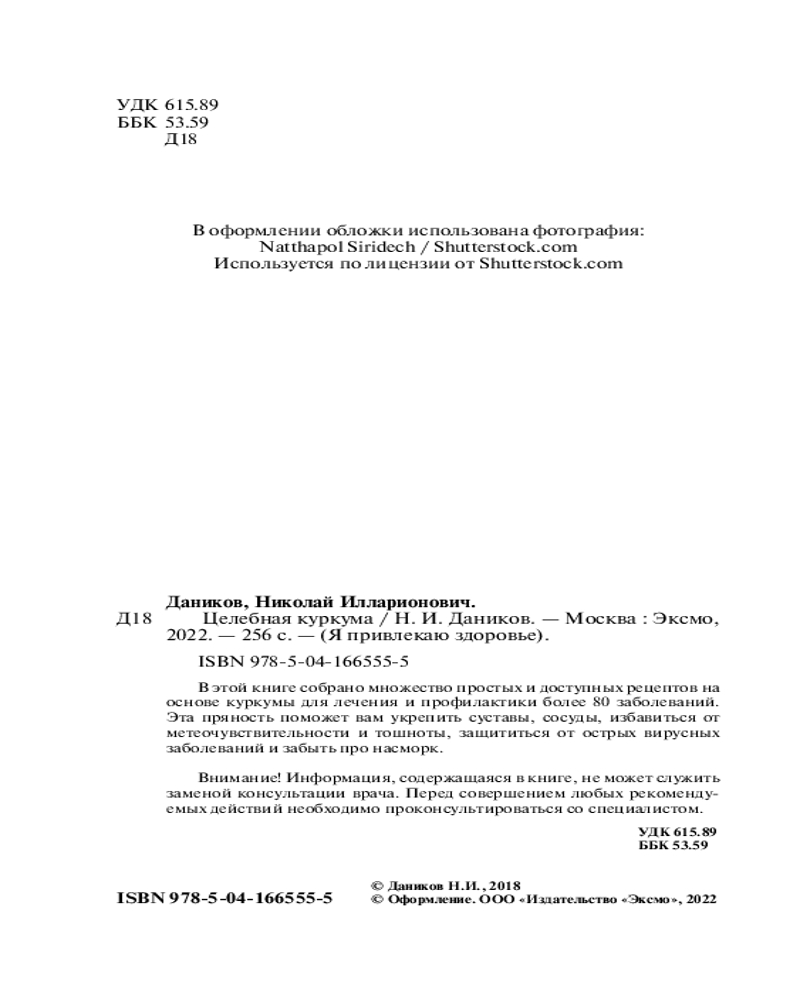 Целебная куркумаВ данный момент этот товар отсутствует в продаже. Возможно, у нас найдется аналогичный или похожий товар здесь. Серия: Я привлекаю здоровье (обложка) В книге собрана важнейшая информация о лекарственных свойствах и способах применения в лечении и кулинарии куркумы, пряности, которая есть на кухне практически у всех. Николай Даников, известный врач-фитотерапевт и автор многочисленных бестселлеров по народной медицине, описывает особенности приготовления вкуснейших блюд и лечебных препаратов из сушеного корня куркумы, куркумного меда для лечения заболеваний ЖКТ, сердечно-сосудистой системы, болезней суставов, метеочувствительности и многих других заболеваний. |