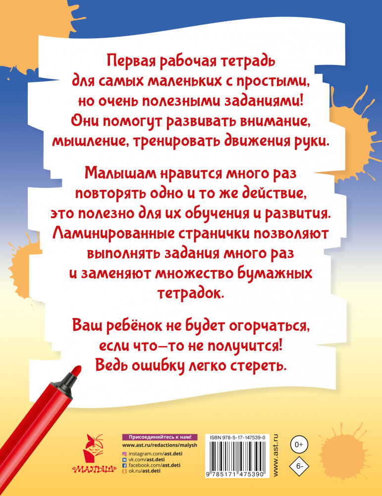 💳 Оплатить за товар можно при получении 🇰🇿 Есть бесплатная доставка по Казахстану от 1 дня 🎁 Копите бонусы с каждой покупки Серия: Многоразовые задания для малышей от 2-х лет Первая рабочая тетрадь для детей младшего возраста с простыми заданиями для развития внимания, мышления, тренировки руки. Малышам нравится много раз повторять одно и то же действие, это полезно для их обучения и развития. Ламинированные странички, на которых можно многократно писать маркером, позволяют выполнять задания много раз и заменяют множество бумажных тетрадей. |