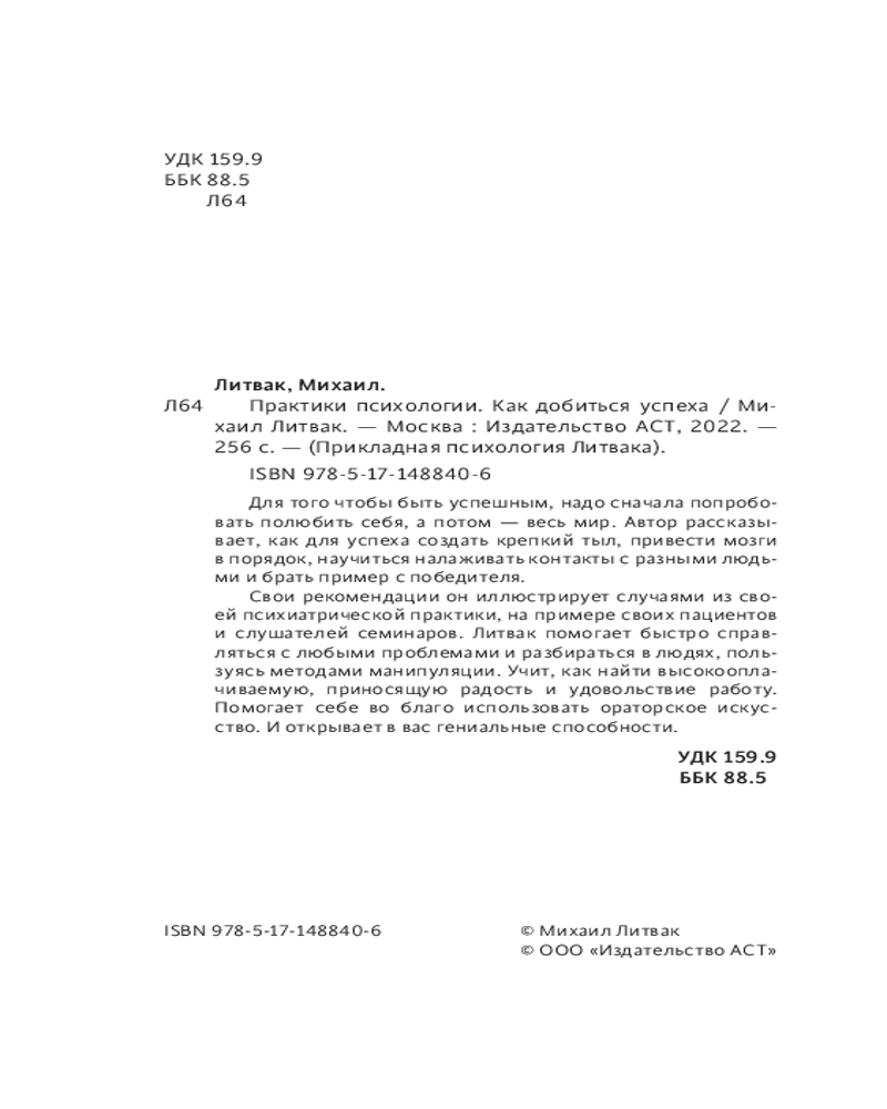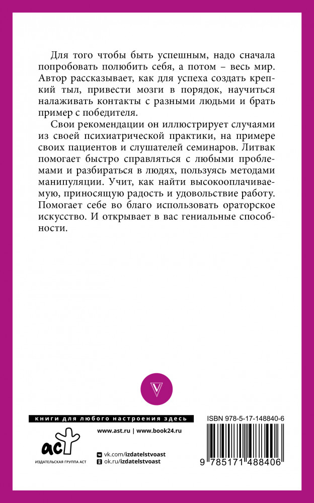 💳 Оплатить за товар можно при получении 🇰🇿 Есть бесплатная доставка по Казахстану от 1 дня 🎁 Копите бонусы с каждой покупки Серия: Прикладная психология Литвака Михаил Литвак — ведущий психотерапевт международного реестра, автор книг, изданных тиражом 15 000 000 экземпляров. Он вывел правила психологии и логики, которые помогают быстро справляться со всеми проблемами, пользуясь особыми методами манипуляции. |