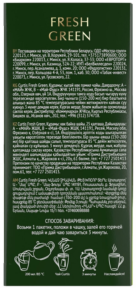 Curtis Чай «Fresh Green»аромат вкус В данный момент этот товар отсутствует в продаже. Возможно, у нас найдется аналогичный или похожий товар здесь. Чай Curtis «Fresh Green» — Китайский байховый зеленый чай. Насладись освежающим ароматом весенних цветов Curtis Fresh Green для яркого дня. Зеленый чай — отличный источник антиоксидантов и питательных веществ, которые благотворно влияют на здоровье. 25 пакетиков. Освежающий натуральный аромат. Изысканный вкус настоящего зеленого чая с бархатистым послевкусием. |